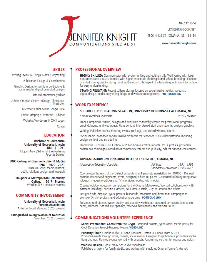 Most recently I’ve worked with the UNO School of Public Administration with higher education projects and marketing, both for credit, and non-credit. Before that I was with the Papio-Missouri River Natural Resources District as an Information/Education Specialist; devising environmental education programs as well as implementing public information communications.